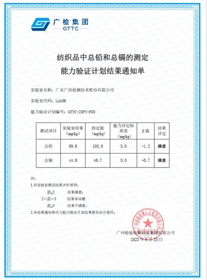 总铅和总镉及pH 值是纺织品化学安全性能的重要考核指标,这次权威机构出具的能力验证结果,充分证明了广纺检测具备优秀的化学检测能力,能够为客户提供准确可靠的检测服务。