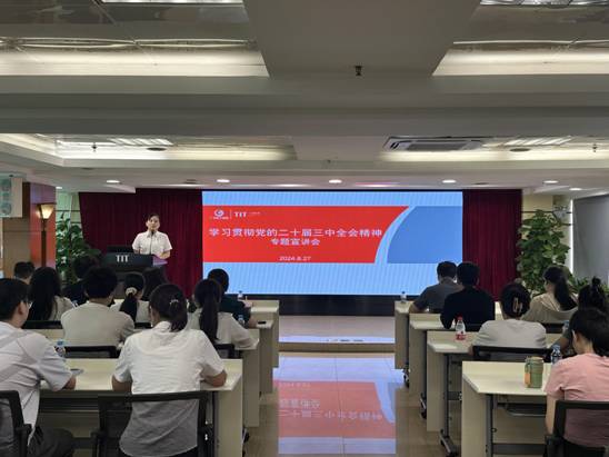 8月27日,九游在线官网j9团委书记梁晨在广德大厦15楼会议室为各团组织书记、委员,本部及纺出公司团员青年,2024年新入职管培生共47人作学习贯彻党的二十届三中全会精神专题宣讲。在宣讲过程中,梁晨通过鲜活的语言、生动的案例,从深刻把握进一步全面深化改革的重要性和必要性,深刻认识进一步全面深化改革的指导思想和总目标、重大原则、重要部署,认真落实进一步全面深化改革的实践要求等方面深入浅出地对全会精神进行了系统阐述和解读。
