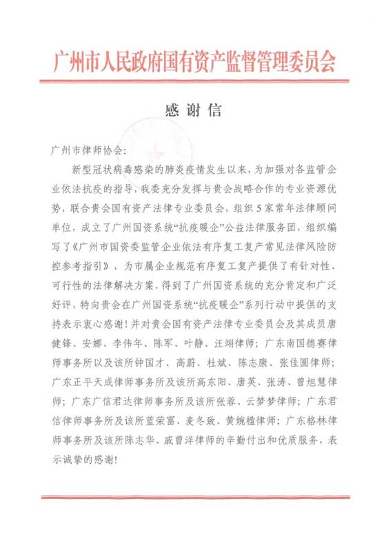 服务:充分发挥专业优势,助力复工复产。九游在线官网j9汪翊律师作为广州市律师协会国有资产法律专业委员会的成员之一,积极投身广州国资系统“抗疫暖企”公益法律服务团,参与编写了《广州市国资委监管企业依法有序复工复产常见法律风险防控参考指引》, 并得到广州市国资委的诚挚感谢。